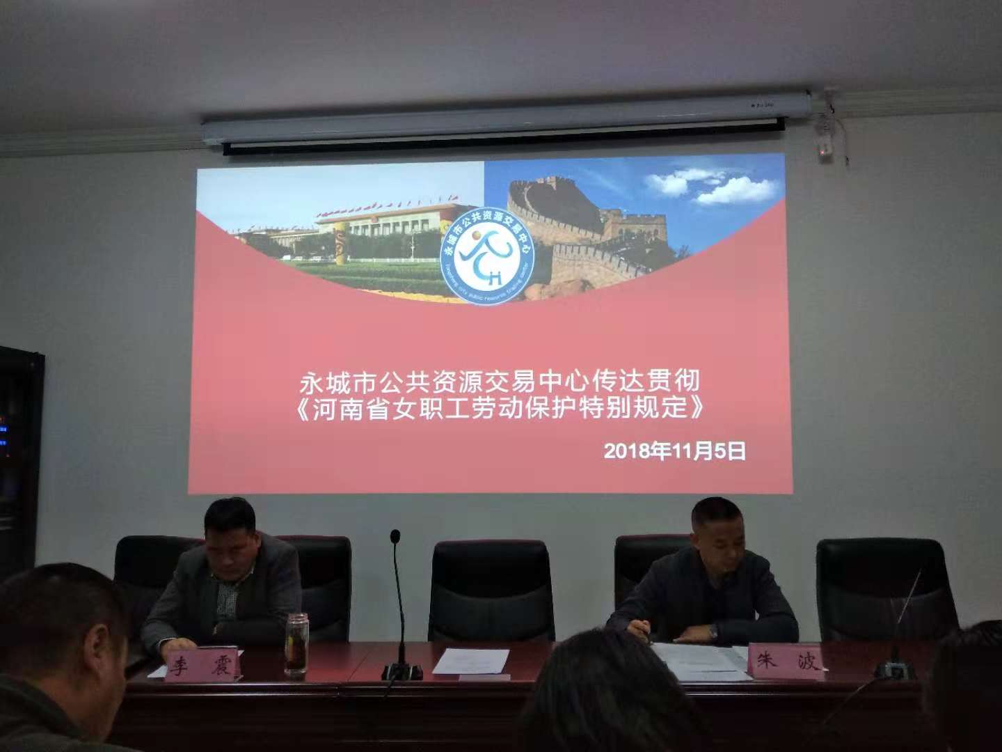 2018年11月5日,全体工会委员及工会成员在会议室召开永城市公共资源交易中心工会委员会2018年第二次会议。会议由工会主席朱波主持,会上首先传达了省政府令文件《河南省女职工劳动保护特别规定》,随后对工会相关事宜进行了安排部署。