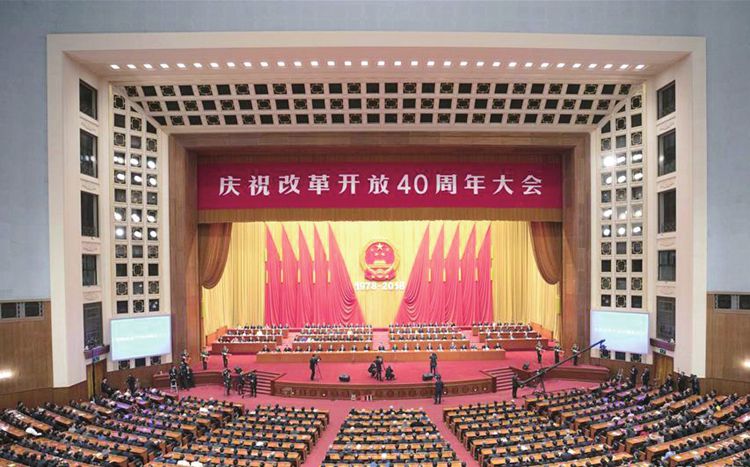 人民大会堂雄伟庄严,万人大礼堂灯火辉煌、气氛热烈。主席台上方悬挂着“庆祝改革开放40周年大会”会标,后幕正中是中华人民共和国国徽和“1978-2018”字标,10面红旗分列两侧。