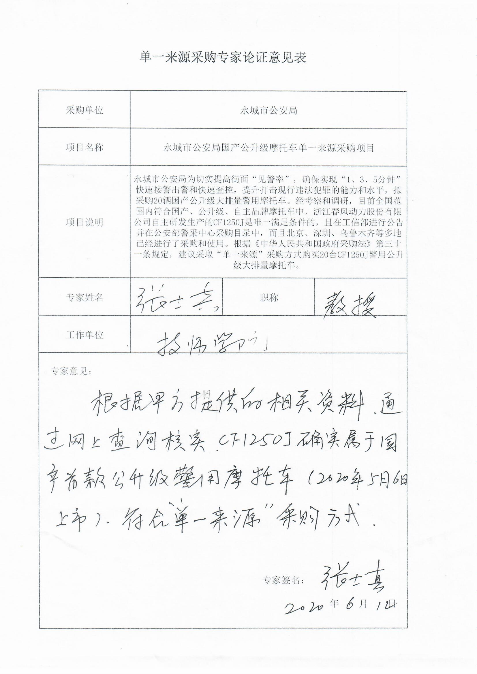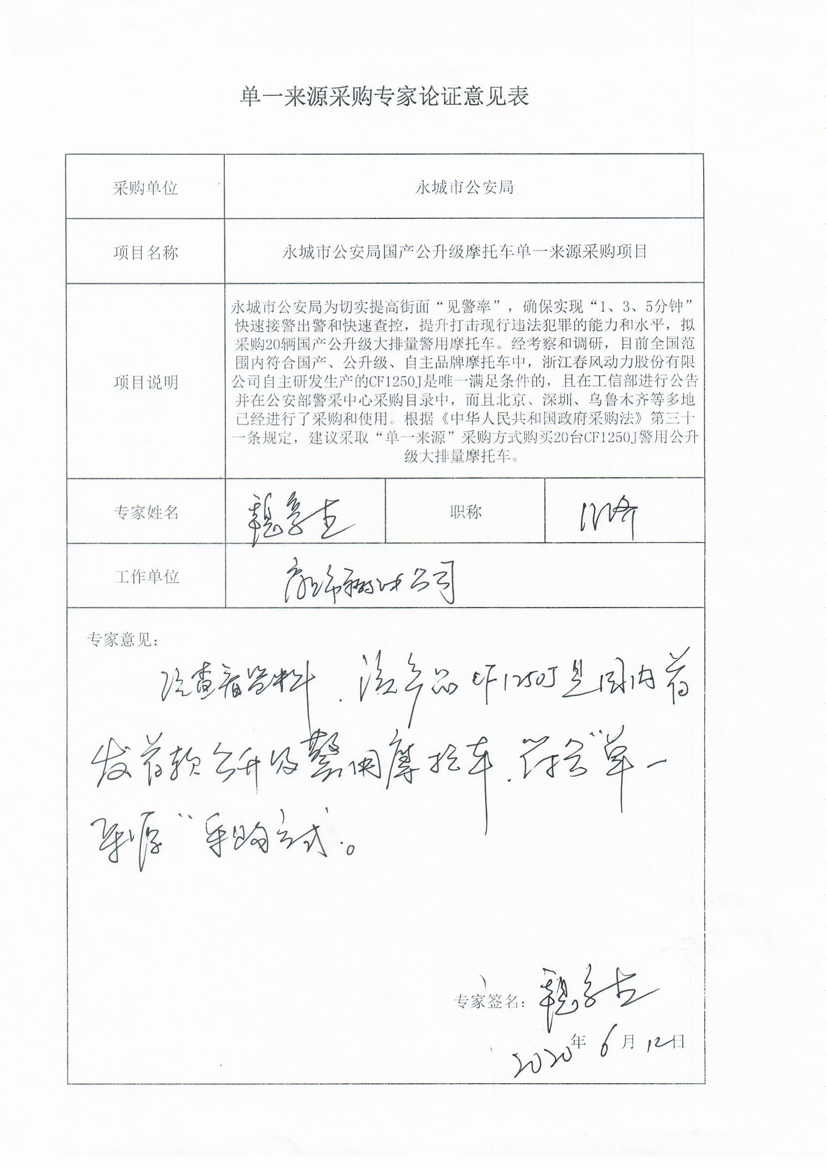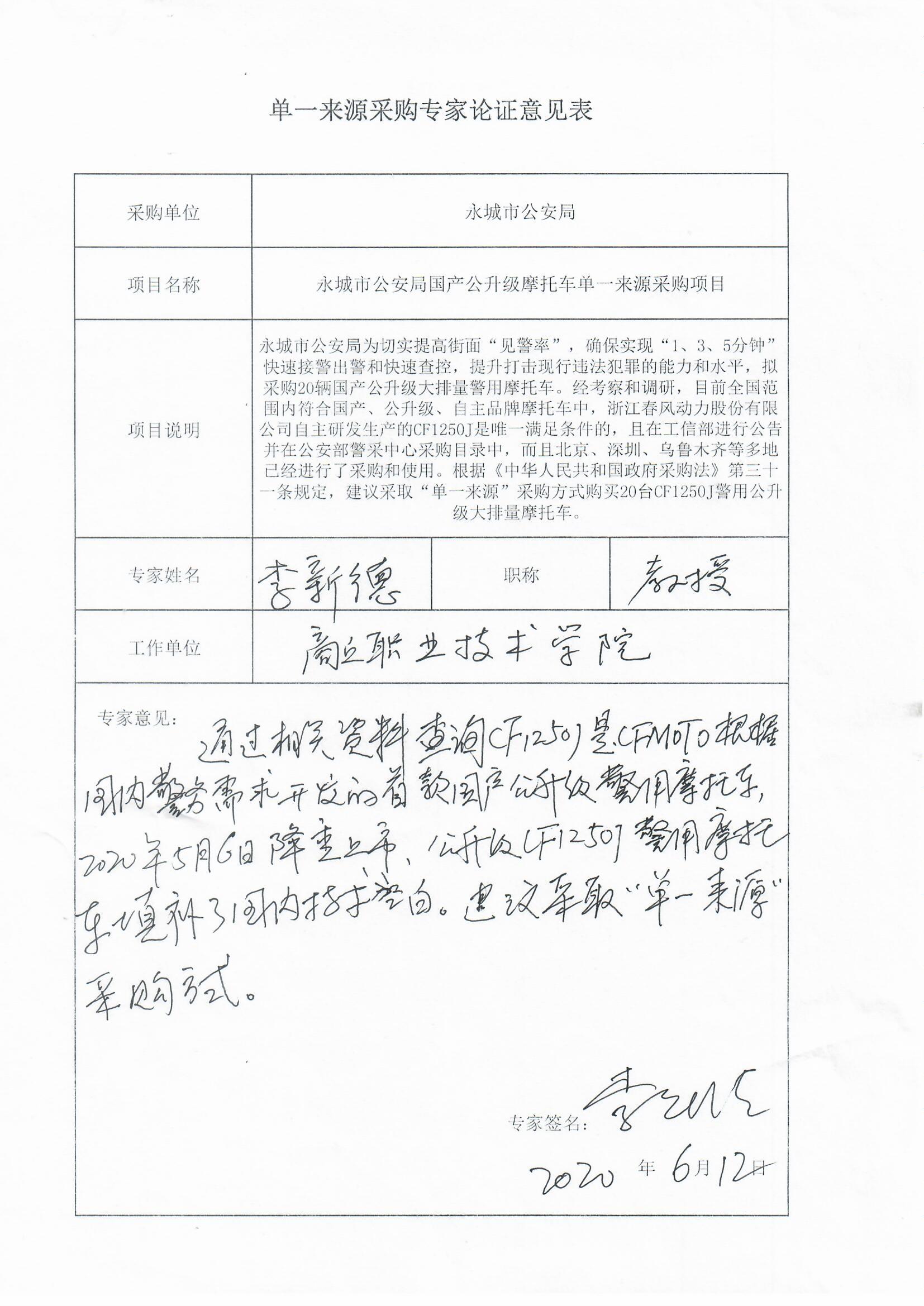 3.论证意见:根据甲方提供得相关资料,通过网上查询核实,CF1250J确实属于国内首款公升级警用摩托车(2020年5月6日上市),符合“单一来源”采购方式。