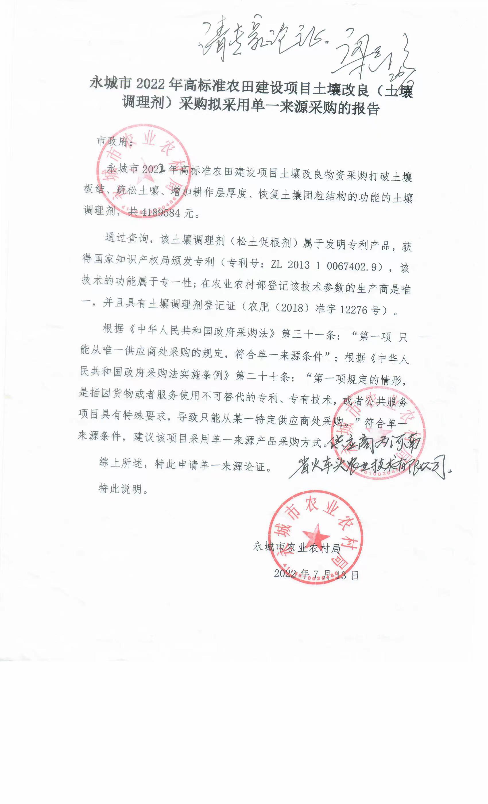 永城市农业农村局2022年高标准农田建设项目土壤改良(土壤调理剂)采购的土壤调理剂(松土促根剂)是一种有效的土壤改良产品,该产品对改良土壤、加深耕层、增肥地力、促进根系生长发育、提高土壤的保水、保肥,提高土壤的抗逆性,减少农业污染,提高农产品质量有一定的促进作用。该产品取得了国家发明专利,并经过国家合法登记,产品来源单一。根据《中华人民共和国政府采购法》第三十一条和《中华人民共和国政府采购法实施条例》第二十七条规定,可以作为单一来源产品采购。 |